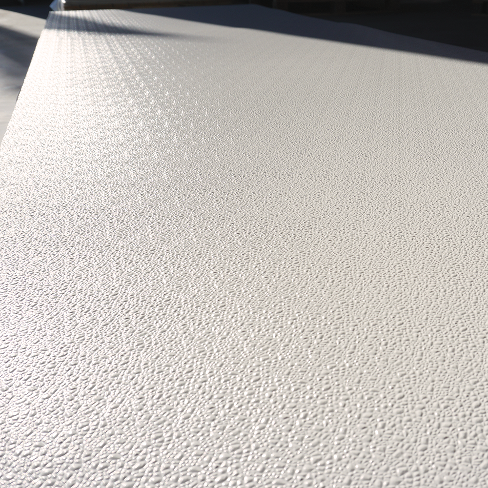 De plaat is voorzien van een duurzame reliëfstructuur die zorgt voor verhoogde krasbestendigheid, betere waterafvoer en verbeterde reinigbaarheid. De afwerking is onderhoudsarm en geschikt voor intensief en professioneel gebruik.